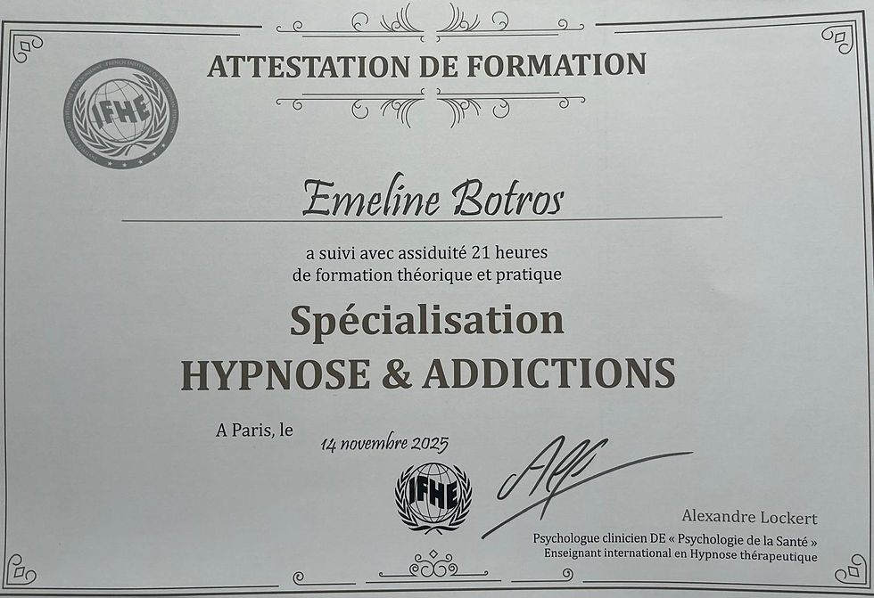 • Praticienne certifiée en hypnose et addictions - IFHE - PARIS